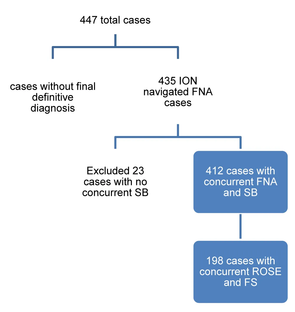 In this retrospective, we reviewed 447 transbronchial sampling of lung lesions performed using the ION-navigation bronchoscopy at our institution from September 1, 2020, to December 31, 2022. Patients were included if they had radiologically detected pulmonary nodules or masses suspicious for either malignancy or benign lesions. ION robotic bronchoscopy provides navigated access to peripheral lung lesions, from which clinicians submitted FNA and SB specimens for pathologic evaluation. ROSE of FNA smears and/or FS evaluation of biopsy tissue were performed when requested to assist with lesion localization or provide preliminary diagnostic guidance [3.4].