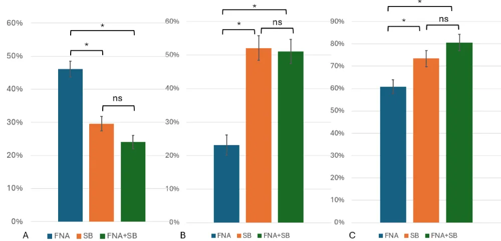 The overall diagnostic yield was highest with the combined FNA+SB approach at 76%, followed by SB alone at 70%, and FNA alone at 54%. Moreover, the combined method achieved the highest rate of definitive diagnoses (67%), highlighting its effectiveness in reducing non-diagnostic outcomes (Table 2).