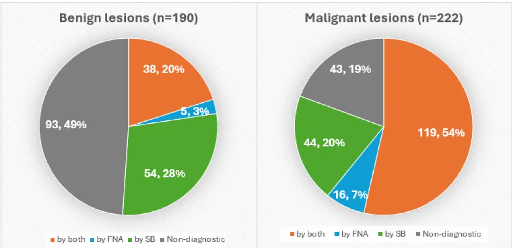 The nature of the lesion had a notable impact on diagnostic success. Malignant lesions (n=179, yield of 81%) had a significantly higher diagnostic yield compared to benign lesions (n=97, yield of 51%) (Figure 4). SB was particularly effective in obtaining diagnostic material from benign lesions, reinforcing its value in such cases.