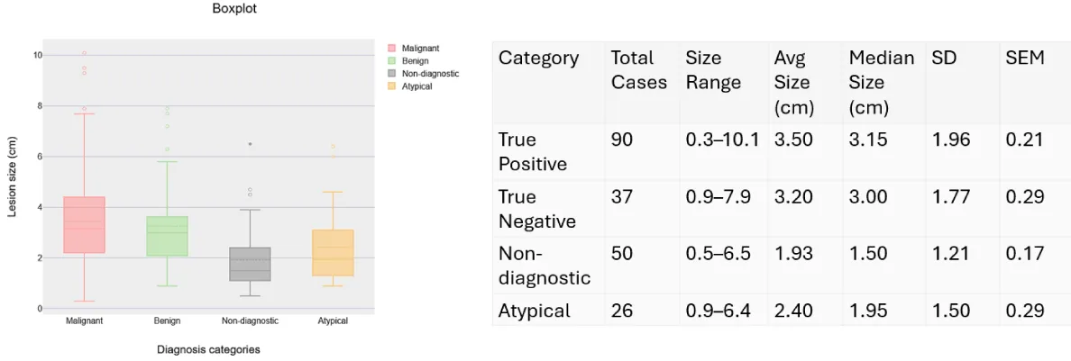 Among the 206 cases with available radiological measurements, lesions that received definitive diagnoses had an average size of 3.38 cm, significantly larger than the 2.09 cm average for non-diagnostic cases; a difference of 1.29 cm (95% CI: 0.80–1.78, p < 0.0001). When stratified by diagnostic category, malignant lesions averaged 3.50 cm, benign lesions 3.20 cm, atypical lesions 2.40 cm, and non-diagnostic lesions 1.93 cm (Figure 5).