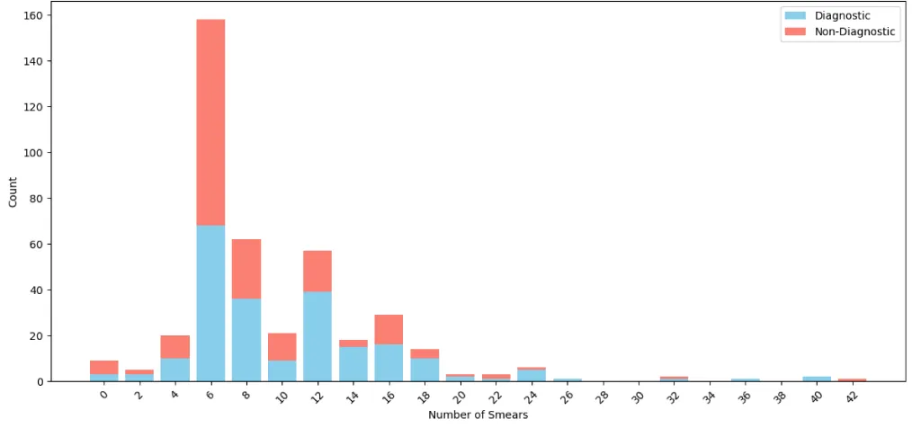 We also analywhether the number of smears affects the diagnostic yield. The majority of cases had 6 smears, with 57% of those being non-diagnostic. Cases with 12 smears, 14 smears, and 24 smears had the lowest non-diagnostic rate, but on further analysis, it was observed that these cases were associated with malignant diagnoses (Figure 6).