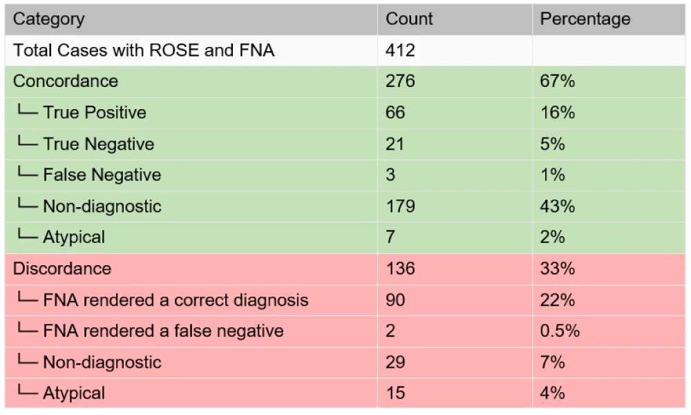 Among the 412 cases with both ROSE and FNA performed, there was a 67% concordance rate between ROSE and FNA results. Of these, a substantial portion (43%) was non-diagnostic. In discordant cases, FNA provided the correct diagnosis in 90 cases (22%), while 44 cases (11%) remained inconclusive (Figure 9).