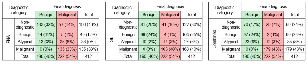 The non-diagnostic rate varied significantly among the three testing modalities, with FNA showing the highest rate at 46%, compared to 30% for SB and 24% for the combined approach (Table 2). This difference highlights the superior reliability of SB in obtaining adequate diagnostic material, particularly in benign lesions.